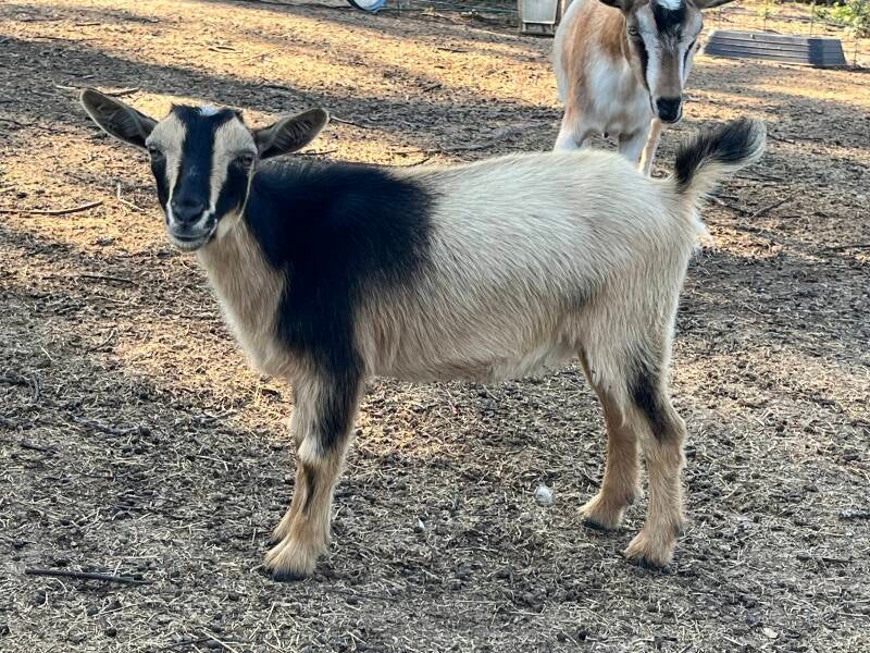 This doeling is super cute. She was a single kid and was dam raised. She will be bred 2025 for her first kidding.